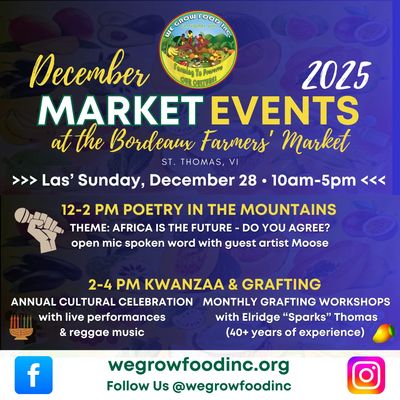 We Grow Food, Inc. presents their monthly special events for November 2025 at Bordeaux Farmers' Market on St. Thomas, VI. While their farmers markets are always the 2nd and Las' Sundays of every month between 10:00 a.m.-5:00 p.m., sometimes there are also special activities on those market days.